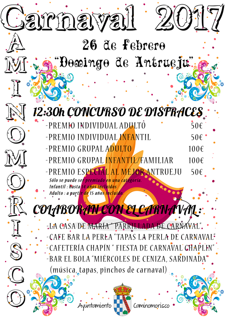 Domingo 26 de Febrero " DOMINGO DE ANTRUEJU" 12:30h - Concursos de Disfraces : - Premio Individual adulto : 50€ - Premio individual Infantil :...